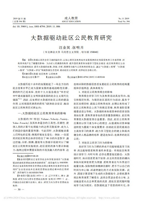 大数据驱动社区公民教育研究 (湖北成人教育学院学报; No. 11) 出版年份: 2019 作者: Wang Jinying | Zhang Mingyue 机构作者: Heilongjiang Education College 大数据以其符合学习者的脑科学、认知心理学及教育技术发展规律的优势深受教育工作者青睐,对 教育系统产生了颠覆性影响。为办好人民满意的教育,提升国民素质和加强学习型社会建设,社区教育理应主动 与大数据相结合,探寻大数据的收集、存储、分析、预测等功能与公民教育的契合点,通过“大数据 + 统筹”“大数据 + 服务”“大数据 + 评估”构建数据生态空间,驱动社区公民教育,培养社区合格公民。