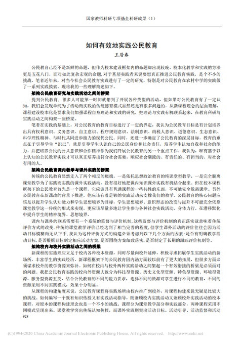 如何有效地实践公民教育 出版年份: 2016 作者: Wang Juchun 机构作者: Management Office of National Teacher Research Fund 公民教育已经不是新鲜的命题,但作为校本建设框架内的命题却出现较晚。校本化教学和实践的方法更是五花八门,面对如此复杂宏观的命题, 对于基层实践者来说要想真正推进公民教育实践,是个不小的挑战。笔者近年来,对当今社会公民教育实践进行了一定的研究,特别是对公民教育在农村中学的实践做了一系列实践摸索。现将我的一些理解简述如下。