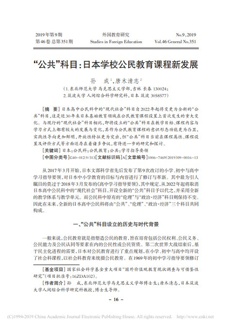 "公共" 科目:日本学校公民教育课程新发展 (外国教育研究; Vol. 46, No. 9) 出版年份: 2018 作者: Sun Cheng | Karaki Kiyoshi 机构作者: Northeast Normal University 日本高中公民科中的“现代社会”科目自2022年起将变更为全新的“公 共”科目,这是近30年来日本基础教育领域在公民教育课程设置上首次发生的重大变 化。与现行的“现代社会”科目相比,即将设立的“公共”科目在教学目标、课程内容与 学习方式上都有较大的发展与变化,其作为公民教育课程的意识形态功能更为凸显, 实践性导向更加鲜明,开放性特征更为突出,但“公共”科目当前在课程属性、课程设 置及评价方式等方面还存在着诸多争议,有待进一步的研究和探讨。