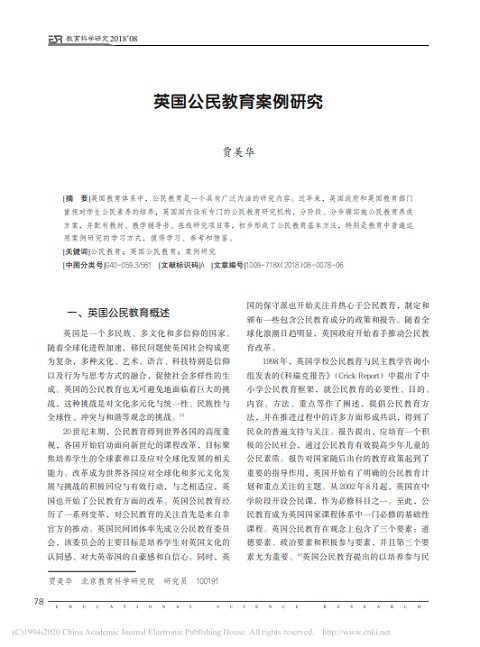 英国公民教育案例研究 (教育科学研究; No. 8) 出版年份: 2018 作者: Jia Meihua 机构作者: Beijing Academy of Educational Sciences | Beijing Radio and Television University 英国教育体系中,公民教育是一个具有广泛内涵的研究内容。近年来,英国政府和英国教育部门 重视对学生公民素养的培养,英国国内设有专门的公民教育研究机构,分阶段、分步骤实施公民教育养成 方案,并配有教材、教学辅导书、在线研究项目等,初步形成了公民教育基本方法,特别是教育中普遍运 用案例研究的学习方式,值得学习、参考和借鉴。