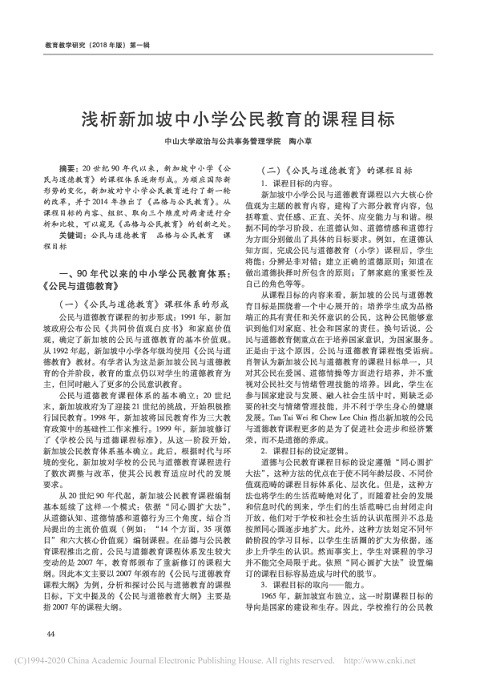 浅析新加坡中小学公民教育的课程目标 出版年份: 2018 作者: Tao Xiaocao 机构作者: Guangdong Chenyue Education Development 20 世纪 90 年代以来 , 新加坡中小学 《 公 民 与 道德教育 》 的课程体系逐渐形成 。 为顺应国际新形势的变化 , 新加坡对中小学公民教育进行了新一轮的改革 , 并于 2014 年推出了 《 品格与公民教育 》 。 从课程 目标的内容 、 组织 、取向三个维度对两者进行分析和比较 , 可以 窥见 《 品格与 公民 教育 》 的创新之处 。