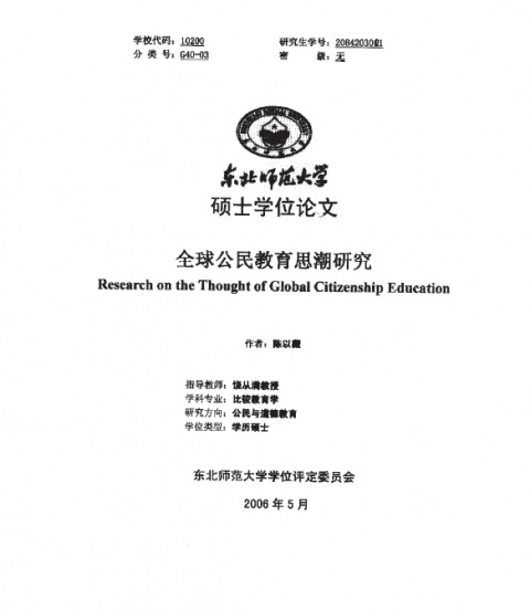 全球公民教育思潮研究 出版年份: 2006 作者: Chen Yicang 通过教育使个体成为一个合格的公民,这是每个民族国家对成员个体发展的基本期望,也是教育最基本的目标之一。正是由于这样的背景,公民资格和公民教育理论,不断得到发展。然而自20世纪80年尤其是90年代以来,随着全球化趋势的增强以及全球化论的兴起,公民的定位、现代公民资格理论以及公民教育理论不断受到了挑战。全球公民教育教育思想就是在这样的背景形成了一股思潮。这一思潮在发达国家的教育实践中已经有所体现。我国已经加入了世界贸易组织,与国际交往日益扩大和加深。因此,在全球化的浪潮中,我国的公民教育怎样应对全球化的挑战,是一个必须面对的课题。因此,研究全球公民教育思潮,其意义是不言而喻的。本文主要基于文献研究,考察与分析全球公民教育思潮,追溯其历史渊源和发展历程,探讨全球公民资格观和全球公民教育观的特征及其影响。本文共由绪论和正文四个部分组成。第一部分主要是追溯全球公民教育思想的历史渊源和发展历程,按照前现代时期、现代时期和后现代时期这一历史分期,考察和分析了全球公民教育思想在每个阶段的特征。第二部分在分析了现代公民资格观的特征、全球化对现代公民资格观的挑战之后,探讨了全球公民资格观的内涵。第三部分主要分析和考察了全球公民教育观的主要内容。第四部分在归纳和总结了全球公民教育思潮的特征和考察了全球公民教育思潮的理论和实践性影响的基础上,对其作了简短的评价。
