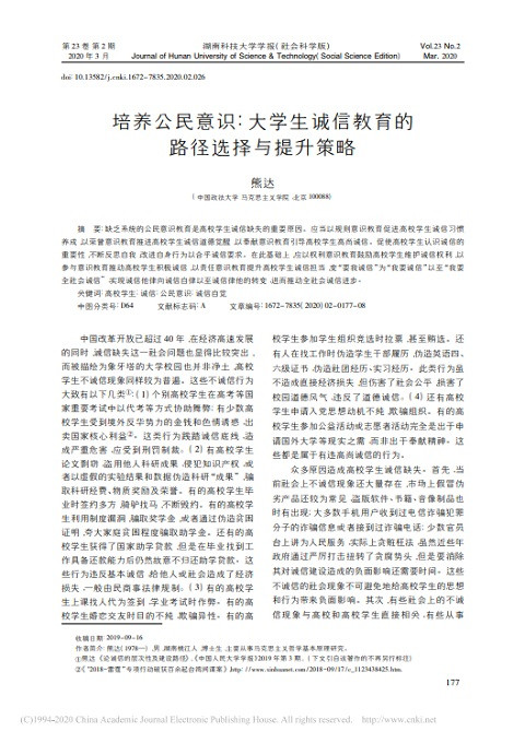 培养公民意识: 大学生诚信教育的路径选择与提升策略 出版年份: 2020 作者: Xiong Da 机构作者: 湖南科技大学 缺乏系统的公民意识教育是高校学生诚信缺失的重要原因。应当以规则意识教育促进高校学生诚信习惯 养成,以荣誉意识教育推进高校学生诚信道德觉醒,以奉献意识教育引导高校学生高尚诚信。促使高校学生认识诚信的 重要性,不断反思自我,改进自身行为以合乎诚信要求。在此基础上,应以权利意识教育鼓励高校学生维护诚信权利,以 参与意识教育推动高校学生积极诚信,以责任意识教育提升高校学生诚信担当,变“要我诚信”为“我要诚信”以至“我要 全社会诚信”,实现诚信他律向诚信自律以至诚信律他的转变,进而推动全社会诚信进步。