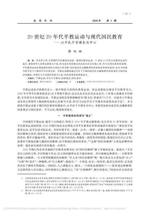 20世纪20年代平教运动与现代国民教育—以平民千字课本为中心 出版年份: 2020 作者: Guo Shuanglin 机构作者: Historiographic Studies 从本质上讲,中国现代平民教育运动是一场国民教育运动。20世纪20年代公民教育运动兴 起后,晏阳初等人虽然也曾致力于此,但无论从其思想认识还是从社会实践上看,均不出国民教育的范围。 平民教育运动在塑造现代国民方面的主要贡献,是向底层社会播散现代国家观念和国民意识,这从当时编 写的平民千字课本中可以看出来。平教运动期间通过平民千字课向底层社会播散现代国家观念与国民意 识的做法,对我们今天完成民族复兴大业,仍有着重要的借鉴意义。