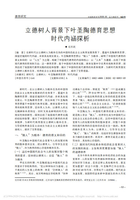 立德树人背景下叶圣陶德育思想时代内涵探析 出版年份: 2020 作者: Ren Sumin 机构作者: Chinese Educational Science 在新时代以立德树人为根本任务的中国特色社会主义教育发展背景下,重温叶圣陶德育思想, 深度挖掘其时代内涵,非常具有现实意义。叶圣陶德育思想以 “做人”为根本,阐明了中国现代德育的 意义和目的; 以 “人生”为主题,构建了中国现代德育的内容和核心; 以 “人本”为遵循,总结了中国 现代德育的原则和方法。这一德育思想,基于中国现代教育实践,继承发展中华优秀传统教育思想,深 刻总结了我国现代德育实践的经验和智慧,揭示了中国特色现代德育的本质和规律,为新时代教育落实 立德树人根本任务,培养社会主义建设者和接班人,提供了宝贵借鉴。