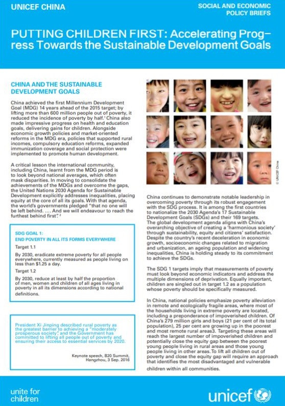 将儿童置于首位:加快实现可持续发展目标 出版年份: 2016 机构作者: UNICEF China 本报告总结了中国在落实可持续发展目标与保障儿童权益方面所面临的挑战与取得的成就,并提出政策建议。