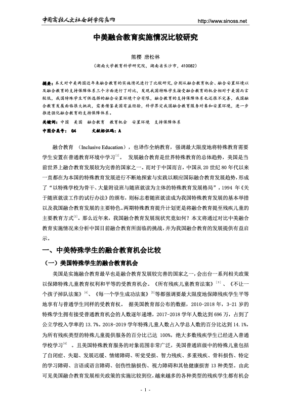 中美融合教育实施情况比较研究 出版年份: 2022 作者: 熊樱 | 唐松林 本文对中美两国近年来融合教育的实施情况进行了比较研究,分别从融合教育机会、融合安置环境以及融合教育的支持保障体系三个方面进行了对比,发现我国特殊学生接受融合教育的机会相对于美国而言较低,我国特殊学生可供选择的融合安置环境十分有限,融合教育的支持保障体系也还很不完善,我国融合教育发展面临很大挑战,需要借鉴美国有益经验,科学界定我国融合教育服务对象和安置环境,进一步推进强化融合教育的支持保障体系。