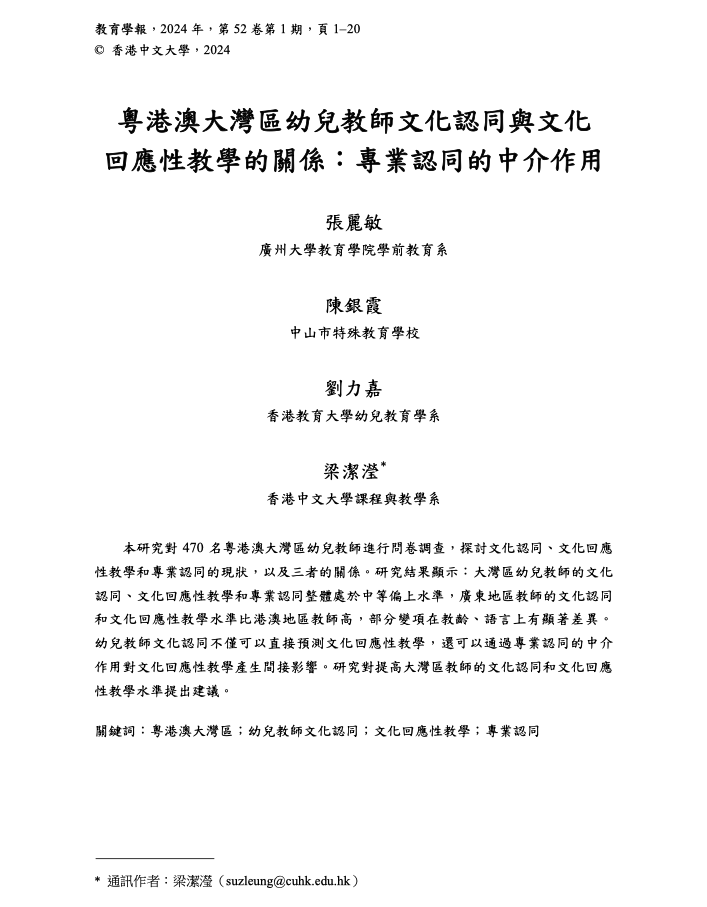 粵港澳大灣區幼兒教師文化認同與文化回應性教學的關係:專業認同的中介作用 (教育学报 第52卷 第1期) 出版年份: 2024 作者: 张丽敏 | 陈银霞 | 刘力嘉 | 梁洁滢 本研究对 470 名粤港澳大湾区幼儿教师进行问卷调查,探讨文化认同、文化回应 性教学和专业认同的现状,以及三者的关系。研究结果显示:大湾区幼儿教师的文化认同、文化回应性教学和专业认同整体处于中等偏上水准,广东地区教师的文化认同和文化回应性教学水准比港澳地区教师高, 部分变项在教龄、 语言上有显著差异。 幼儿教师文化认同不仅可以直接预测文化回应性教学, 还可以通过专业认同的中介作用对文化回应性教学产生间接影响。研究对提高大湾区教师的文化认同和文化回应 性教学水准提出建议。
