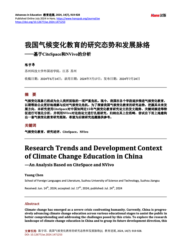 我国气候变化教育的研究态势和发展脉络 : 基于CiteSpace和NVivo的分析 (教育进展 第14卷 第7期) 出版年份: 2024 作者: 陈宇昂 气候变化现象已然成为全人类所面临的一项严重危机。现今,我国在各个学段逐步推进气候变化教育,以期帮助公众更好地理解与应对气候变化危机。为了探索我国气候变化教育的研究态势,把握其未来发展方向,本研究使用CiteSpace对中国知网近15年气候变化教育研究论文的发文趋势、关键词演进等特征进行可视化分析,并利用NVivo对这些论文进行扎根研究,归纳出其上位范畴,尝试自下而上地建构出一套气候变化教育研究框架,希望为后续研究选题提供参考。