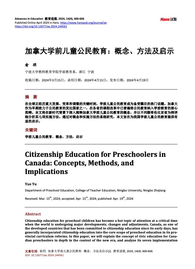 加拿大学前儿童公民教育:概念、方法及启示 (教育进展 第14卷 第4期) 出版年份: 2024 作者: 俞玥 在全球正经历重大发展、变革和调整的关键时刻,学前儿童公民教育成为备受瞩目的热门话题。加拿大作为早期致力于公民教育的发达国家之一,在各省的课程改革中已普遍将公民教育纳入学前教育的核心范畴。本文将在新时代背景下深入阐释加拿大学前儿童公民教育的概念,并以不列颠哥伦比亚省为例详细分析其七项实施方法。通过对概念和实施方法的系统研究,本文旨在为我国学前儿童公民教育提供有益的启示。