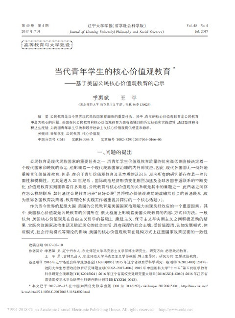 当代青年学生的核心价值观教育: 基于美国公民核心价值观教育的启示 (辽宁大学学报, 哲学社会科学版; Vol. 45, No. 5) 出版年份: 2017 作者: Ji Huibin | Wang Ping 机构作者: Liaoning University 公民教育是当今世界现代民族国家都面临的重要任务。其中,青年的核心价值观教育是公民教育中最为核心的问题。美国在其公民教育和核心价值观教育方面有着独到的历史经验和实践逻辑,通过整理和分析这些经验,为我国青年学生弘扬和践行社会主义核心价值观提供借鉴和启示。