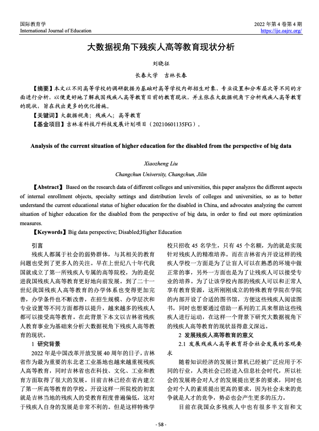 大数据视角下残疾人高等教育现状分析 出版年份: 2022 作者: 刘晓征 本文以不同高等学校的调研数据为基础对高等学校内部招生对象、专业设置和分布层次等不同的方面进行分析,以便更好地了解我国残疾人高等教育目前的教育现状,并主张在大数据视角下分析残疾人高等教育的现状,旨在找出更多的优化措施。