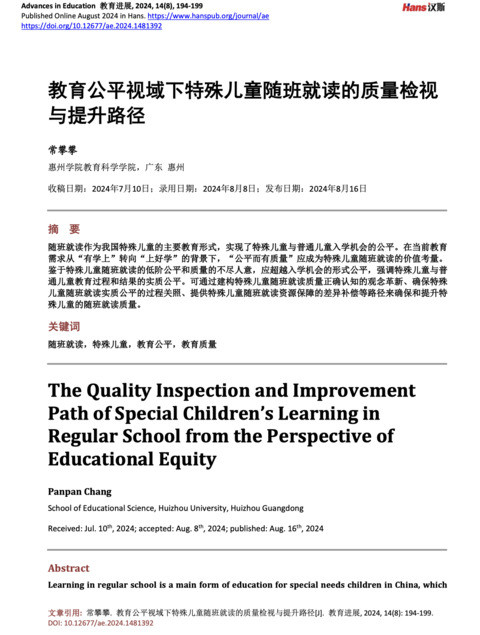 教育公平视域下特殊儿童随班就读的质量检视与提升路径 (教育进展 第14卷 第8期) 出版年份: 2024 作者: 常攀攀 机构作者: 汉斯出版社 随班就读作为我国特殊儿童的主要教育形式,实现了特殊儿童与普通儿童入学机会的公平。在当前教育 需求从“有学上”转向“上好学”的背景下,“公平而有质量”应成为特殊儿童随班就读的价值考量。 鉴于特殊儿童随班就读的低阶公平和质量的不尽人意,应超越入学机会的形式公平,强调特殊儿童与普 通儿童教育过程和结果的实质公平。可通过建构特殊儿童随班就读质量正确认知的观念革新、确保特殊 儿童随班就读实质公平的过程关照、提供特殊儿童随班就读资源保障的差异补偿等路径来确保和提升特 殊儿童的随班就读质量。