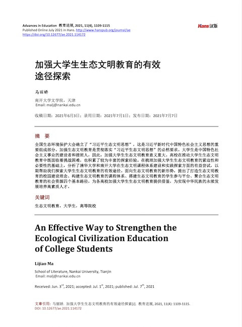 加强大学生生态文明教育的有效途径探索 (教育进展; vol. 11, no. 4) 出版年份: 2021 作者: Lijiao Ma 本文以清华大学和南开大学为例,探讨在中国的大学中开展生态文明教育的有效途径。