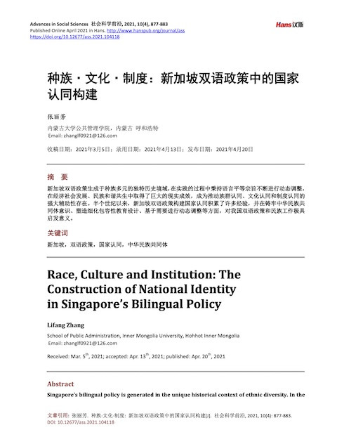 种族·文化·制度: 新加坡双语政策中的国家认同构建 (社会科学前沿; vol. 10, no. 4) 出版年份: 2021 作者: Zhang Lifang 本文介绍了新加坡的双语教育政策,并探讨了相关政策与国家认同建构的关系。