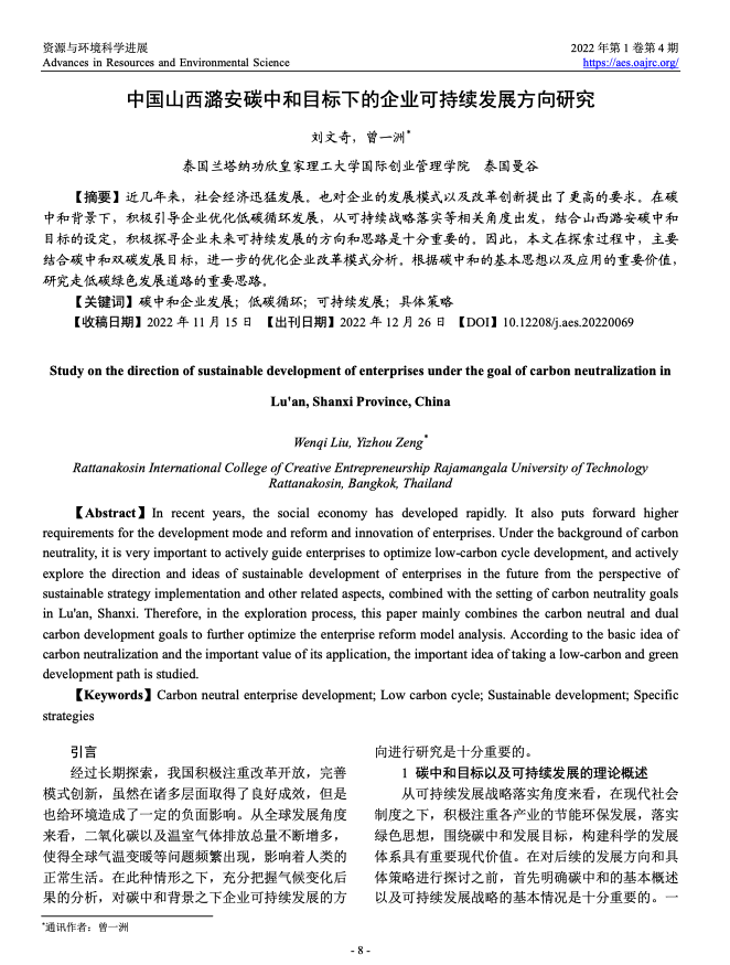 中国山西潞安碳中和目标下的企业可持续发展方向研究 出版年份: 2022 作者: 刘文奇 | 曾一洲 近几年来,社会经济迅猛发展。也对企业的发展模式以及改革创新提出了更高的要求。在碳中和背景下,积极引导企业优化低碳循环发展,从可持续战略落实等相关角度出发,结合山西潞安碳中和目标的设定,积极探寻企业未来可持续发展的方向和思路是十分重要的。因此,本文在探索过程中,主要结合碳中和双碳发展目标,进一步的优化企业改革模式分析。根据碳中和的基本思想以及应用的重要价值,研究走低碳绿色发展道路的重要思路。