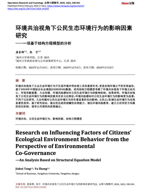 环境共治视角下公民生态环境行为的影响因素研究 : 一项基于结构方程模型的分析 (运筹与模糊学 第14卷 第1期) 出版年份: 2024 作者: 唐家辉 | 张宇 机构作者: 汉斯出版社 环境共治视角下公众生态环境行为不仅是环境冲突治理工具的重要补充,更是实现环境公平的有效途径。 基于2010年中国综合社会调查(CGSS2010)数据,采用结构方程模型考察了环境共治视角下环境主动关 心、环保贡献意愿、大众传媒、环境风险感知对公民生态环境行为的影响机制。结果表明:环境共治视 角下公民生态环境行为的影响因素具有多元化特征;环境风险感知对公民生态环境行为的影响更为显著; 不同于以往研究,大众传媒对公民生态环境行为存在着显著的负向影响;公民公/私域生态环境行为呈现 显著性差异。基于研究结论,提出优化政府前瞻性治理能力、强化环境风险教育、建立公民同官方传媒 的信任机制,倡导公共理性的政策建议。
