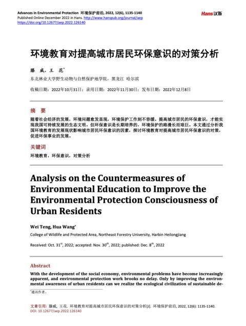 环境教育对提高城市居民环保意识的对策分析 (环境保护前沿 第12卷 第6期) 出版年份: 2022 作者: 滕威 | 王花 机构作者: 汉斯出版社 随着社会经济的发展,环境问题愈发显现,环境保护工作刻不容缓。提高城市居民的环保意识,才能实 现我国可持续发展的生态文明。但环保意识是长期培养的,环境保护的路漫长而艰巨。本文通过分析我 国环境教育的发展现状影响城市居民环保意识的因素,探讨环境教育对提高城市居民环保意识的对策, 促进环保事业的发展。