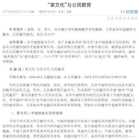“家文化”与公民教育 出版年份: 2017 作者: Liu Xia 机构作者: Chinese Social Science Net 文章把“家文化”作为中国传统文化的核心,并在此基础上比较与西方公民文化的异同。呼吁在公民教育中融合两种文化。