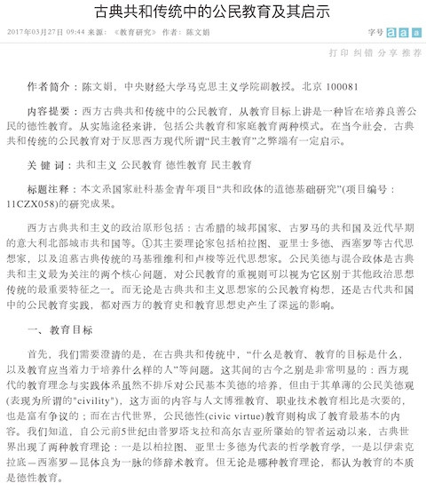 古典共和传统中的公民教育及其启示 出版年份: 2017 作者: Chen Wenjuan 机构作者: Chinese Social Science Net 本文追溯了西方古典著作中的与培养公民相关内容的讨论,把扩培养目标、培养内容、培养方式等,并将此与西方的现代公民教育的内容相对比,从而指出西方公民教育的缺点。