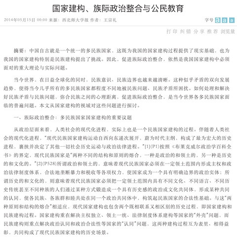国家建构、族际政治整合与公民教育 出版年份: 2014 作者: Wang Zongli 机构作者: Northwest Normal University 文章从民族关系的视角出发,讨论多民族国家建构的议题,并认为公民身份认同与公民教育是多民族国家实现国家建构的关键。