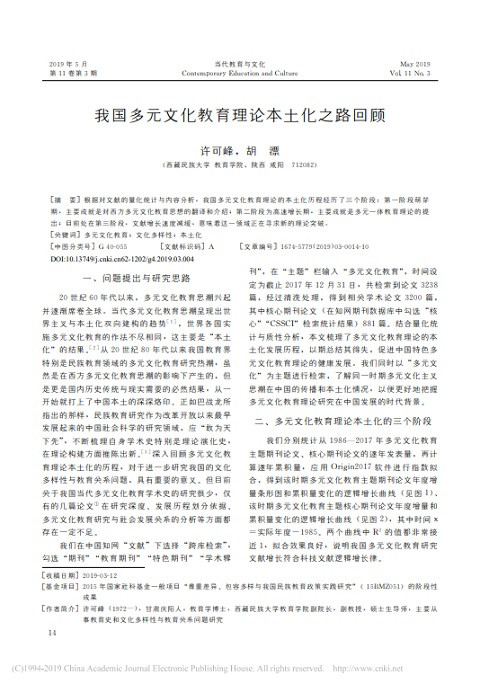 我国多元文化教育理论本土化之路回顾 出版年份: 2019 作者: Xu Kefeng | Hupaio 机构作者: Contemporary Education and Culture 根据对文献的量化统计与内容分析,我国多元文化教育理论的本土化历程经历了三个阶段:第 一 阶 段 萌 芽 期,主要成就是对西方多元文化教育思想的翻译和介绍;第二阶段为高速增长期,主要成就是多元一体教育理论的提 出;目前处在第三阶段,文献增长速度减缓,意味着这一领域正在寻求新的理论突破。