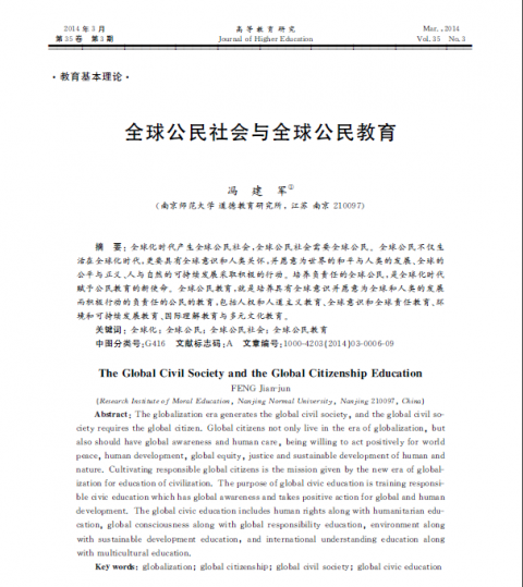 全球公民社会与全球公民教育 出版年份: 2014 作者: Feng Jianjun 全球化时代产生全球公民社会,全球公民社会需要全球公民。全球公民不仅生活在全球化时代,更要具有全球意识和人类关怀,并愿意为世界的和平与人类的发展、全球的公平与正义、人与自然的可持续发展采取积极的行动。培养负责任的全球公民,是全球化时代赋予公民教育的新使命。全球公民教育,就是培养具有全球意识并愿意为全球和人类的发展而积极行动的负责任的公民的教育,包括人权和人道主义教育、全球意识和全球责任教育、环境和可持续发展教育、国际理解教育与多元文化教育。