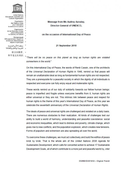 联合国教科文组织总干事奥德蕾·阿祖莱国际和平日致辞 出版年份: 2018 机构作者: UNESCO. Director-General, 2017- (Azoulay, A.) 2018年9月21号,联合国教科文组织总干事奥德蕾·阿祖莱国际和平日致辞