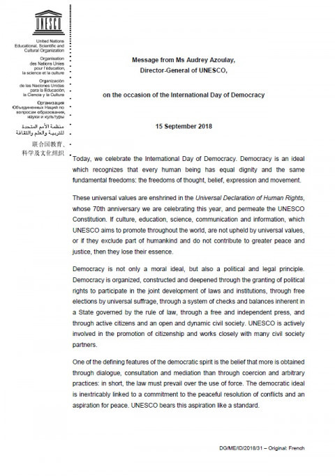 联合国教科文组织总干事奥德蕾·阿祖莱 国际民主日致辞 出版年份: 2018 机构作者: UNESCO. Director-General, 2017- (Azoulay, A.)UNESCO. Director-General, 2017- (Azoulay, A.)UNESCO. Director-General, 2017- (Azoulay, A.) 2018年9月15日,联合国教科文组织总干事奥德蕾·阿祖莱国际民主日致辞