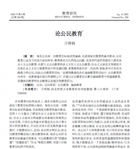 论公民教育 出版年份: 2003 作者: Wan Minggang 培养公民是一切教育目标表述的基础,也是国家对教育的基本要求。公民教育已成为当代西方政治哲学、教育理论关注的热点问题,其具有代表性的理论主要有自由主义公民教育、社群主义公民教育和多元文化主义公民教育。社会主义政治文明建设不仅是社会主义民主制度的设计和完善问题,更重要的是培养一代认同、积极参与并具有实践能力的公民。因此公民教育的目标一定要明确地包含在基础教育的目标中,公民教育的内容也一定要渗透在相关的课程之中,并通过公民教育目标整合基础教育中的道德教育、思想政治教育和社会教育以及相关的教育活动。