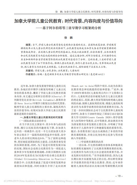 加拿大学前儿童公民教育: 时代背景、内容向度与价值导向; 基于阿尔伯塔等三省早期学习框架的分析 出版年份: 2019 作者: XU Peng 机构作者: Primary and Secondary Education in Foreign Countries 当下,学前儿童公民教育愈发受到西方各国的关注。在国际政策话语、学前教育 课程改革以及儿童公民研究的共同推动下,公民教育逐渐成为加拿大各省学前教育课程的 重要组成部分。在近期儿童公民研究的基础上,形成以政治教育、社会性教育、主体性教育 和公民实践教育为内容向度的理论分析框架。通过主题分析,对阿尔伯塔省、不列颠哥伦比 亚省和新斯科舍省学前教育阶段的公民教育内容进行了分析。总的来看,三省的学前儿童 公民教育凸显了如下价值导向:强调儿童公民权责,倡导儿童为公民主体;变革传统公民身 份,视儿童参与为社会民主的根基;儿童公民话语多元,国际语境下凸显本土立场。
