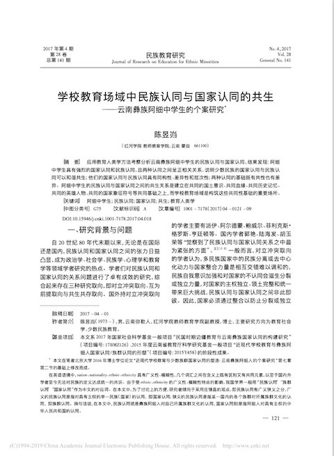 学校教育场域中民族认同与国家认同的共生:云南彝族阿细中学生的个案研究 (民族教育研究; 第28卷, 总第 141 期) 出版年份: 2017 作者: Chen Yukui 机构作者: Minzu University of China 应用教育人类学方法考察分析云南彝族阿细中学生的民族认同与国家认同,结果发现: 阿细 中学生具有强烈的国家认同和民族认同,且两种认同之间呈正相关关系,说明少数民族的国家认同与民族认 同可以和谐共生; 他们的国家认同与民族认同具有同构性、差异性和层次性; 两种认同的基础既有共性也有差 异。阿细中学生的民族认同与国家认同之间的共生关系是建立在共同的国土意识、共同血缘、共同历史记忆、 共同的英雄人物、共同的国家象征符号等共同基础之上,而学校教育场域是构筑这些共同性基础的重要场所。