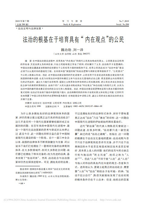 法治的根基在于培育具有‘内在观点’的公民 (学习与探索; No. 7) 出版年份: 2019 作者: Wei Zhixun | Lliu Yize 机构作者: Heilongjiang Academy of Social Sciences 在中国法治建设进程中,培育具有“内在观点”的现代公民具有构成性意义。公民既是法定权利 的享有者,又是法律义务的承担者,只有公民能够真正享有了权利、切实履行了义务,法治秩序才是圆满的。 中国法治建设遭遇诸多困难的症结都在于公民培育方面的缺陷和不足,培育公民因此成为“法治中国”建设 必须予以认真对待的基础性工程。在传统中国“家国同构”的政治逻辑与纲常伦理等级秩序下,“公民意识” 与公民人格难以形成。因此,在中国法治建设独特的历史语境中,公民培育不仅是促进民族整合建设现代民 族国家的根本进路,也是为实现法治中国目标奠定主体与法治文化基础的必由之路,更是国家走向治理现代化的必然选择。通过大力推行法学教育、爱国主义教育和各种各样的公民实践训练,把公民自身成长和经由社会参与的素质积累相结合,有助于将广大民众逐步训练成具有“内在观点”和自治能力的现代公民,从而为法治中国的最终建成奠定坚实的社会文化和人格基础。由此,中国法治建设就逻辑地呈现为具有双重目标的复式结构: 法治必先有助于推动中国的复兴强大,法治保障民权的目标才有现实意义和实现之可能; 它同时历 史地预置了中国公民培育的内在逻辑和基本路径: 在制度建设中训练公民,通过公民的成长推动法治的成长 并臻于至善。