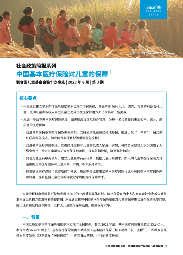 中国基本医疗保险对儿童的保障 出版年份: 2023 作者: 联合国儿童基金会驻华办事处 中国通过建立基本医疗保险制度基本实现了全民医保,参保率达96% 以上。然而,儿童特别是农村儿童、流动儿童和低收入家庭儿童在充分享受医保待遇方面仍面临着一些挑战。应进一步改革基本医疗保险制度,完善制度设计及经办管理,为每一名儿童提供更加公平、充分、高质量的医疗保障:改进城乡居民基本医疗保险参保政策,支持流动儿童在居住地参保,推进出生“一件事”一站式多证联办服务模式,简化医保参保登记等重要服务流程;改进基本医疗保险制度,以更好地支持有儿童的低收入家庭。例如,可结合家庭收入状况调整个人缴费水平,针对儿童群体扩大医保支付范围,提高报销比例,降低起付标准;完善儿童医药服务供给,建立儿童基本药品目录,根据儿童用药需求,扩大纳入基本医疗保险支付范围的儿科医疗服务和儿童用药,并提升相关服务水平;探索建立医疗保险“家庭联保”模式,通过整合城镇职工基本医疗保险与城乡居民基本医疗保险两项制度,提升包括儿童在内的非就业家属的医疗保障水平。