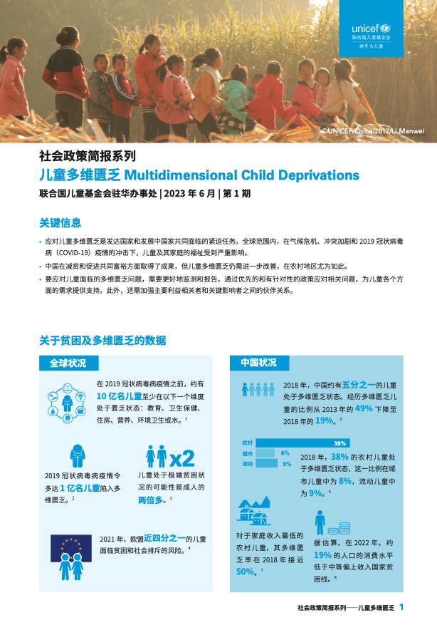儿童多维匮乏 出版年份: 2023 作者: 联合国儿童基金会驻华办事处 应对儿童多维匮乏是发达国家和发展中国家共同面临的紧迫任务。全球范围内,在气候危机、冲突加剧和2019冠状病毒病(COVID-19)疫情的冲击下,儿童及其家庭的福祉受到严重影响。中国在减贫和促进共同富裕方面取得了成果,但儿童多维匮乏仍需进一步改善,在农村地区尤为如此。要应对儿童面临的多维匮乏问题,需要更好地监测和报告,通过优先的和有针对性的政策应对相关问题,为儿童各个方面的需求提供支持。此外,还需加强主要利益相关者和关键影响者之间的伙伴关系。