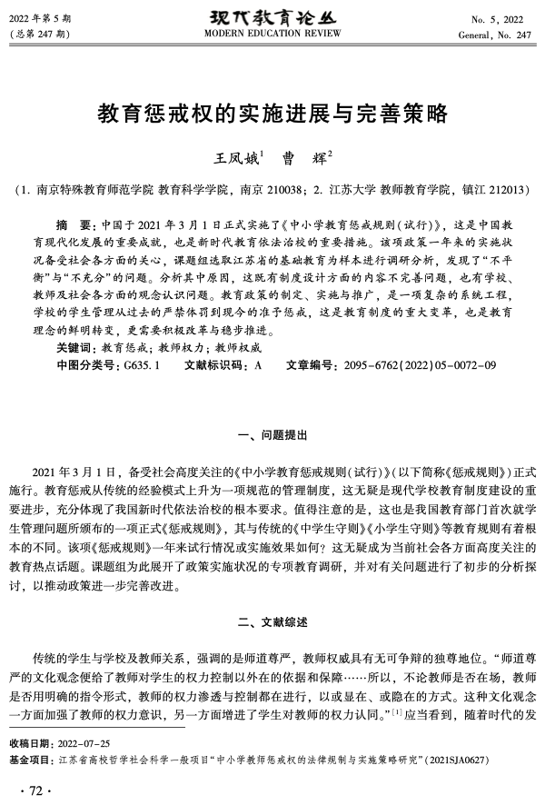 教育惩戒权的实施进展与完善策略 出版年份: 2022 作者: 王凤娥 | 曹辉 中国于 2021年 3月 1日正式实施了《中小学教育惩戒规则(试行)》,这是中国教育现代化发展的重要成就,也是新时代教育依法治校的重要措施。该项政策一年来的实施状况备受社会各方面的关心,课题组选取江苏省的基础教育为样本进行调研分析,发现了"不平衡"与"不充分"的问题。分析其中原因,这既有制度设计方面的内容不完善问题,也有学校、教师及社会各方面的观念认识问题。教育政策的制定、实施与推广,是一项复杂的系统工程,学校的学生管理从过去的严禁体罚到现今的准予惩戒,这是教育制度的重大变革,也是教育理念的鲜明转变,更需要积极改革与稳步推进。