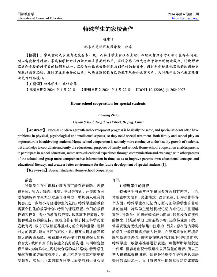 特殊学生的家校合作 (国际教育学 6卷第1期) 出版年份: 2024 作者: 赵建玲 机构作者: 国际开放获取期刊研究中心 正常儿童的成长发育进度基本一致,而特殊学生往往在生理、心理及智力等方面都可能存在问题,所以需要特殊对待。家庭和学校对培养学生都有重要的作用,家校合作不仅更有利于学生的健康成长,还能帮助家庭和学校的教育目的协调与统一。家校合作让家长能够参与到学校的教育中,通过与学校其他家长的沟通和交流总结教育经验,及时掌握更全面的信息,从而提高家长自己的教育观念和教育素养,为特殊学生的未来发展营造更好的环境。