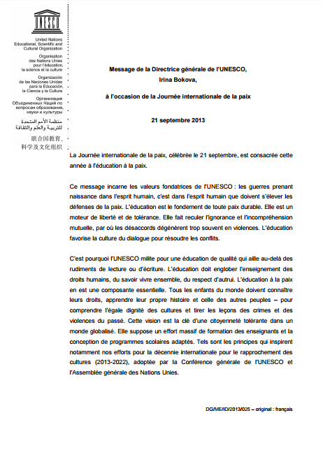 联合国教科文组织总干事伊琳娜•博科娃在国际和平日的致辞,2013年9月21日 出版年份: 2013 机构作者: UNESCO. Director-General, 2009-2017 (Bokova, I.G.) This is the message from Irina Bokova, Director-General of UNESCO on the occasion of the International Day of Peace, 21 September 2013.
